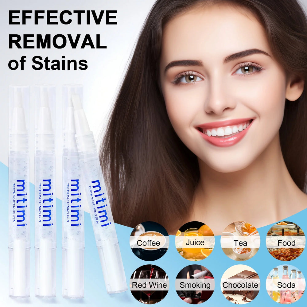 - ELIMINATE SURFACE STAINS WITH EASE - Use our mitimi convenient Teeth Whitening Pen to quickly and easily eliminate surface stains from foods and beverages, such as coffee, wine, spaghetti sauce, and more. The gentle yet effective pen contains essential ingredients that are powerful enough to lift several years' worth of stains, including carbamide peroxide, potassium sorbate, and polysorbate 20. You can see and experience the difference for yourself with the use of our at-home teeth whitening pens.